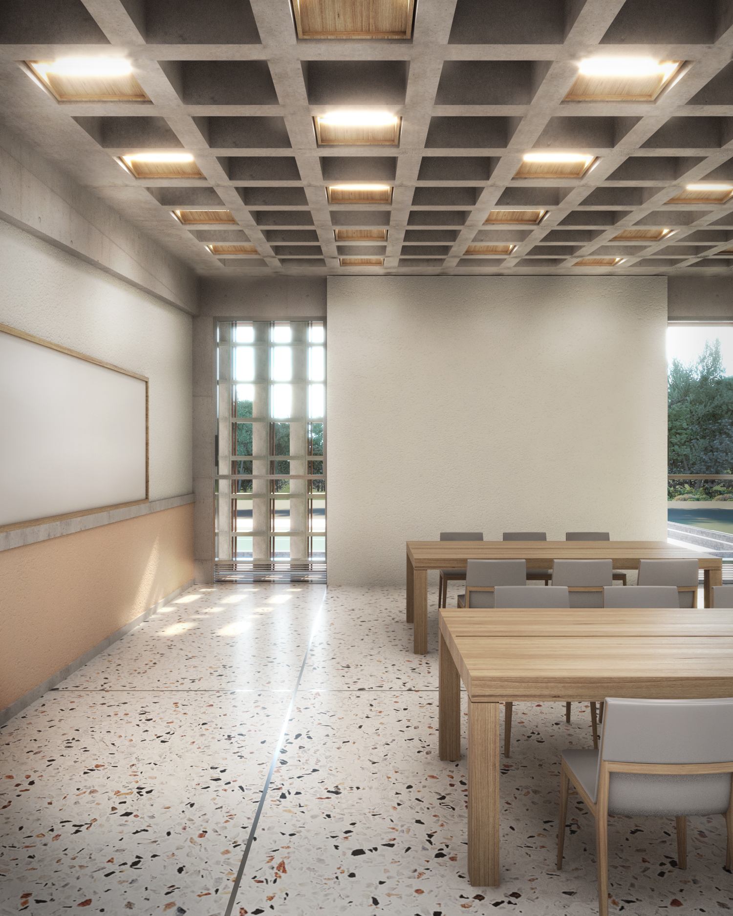 On the other side, as a piece of technology, this building has embedded within its design, a carefully considered environmental strategy that interweaves seamlessly with its tectonic resolution. The use of heavy materials with big thermal mass like concrete and stone, allows for a passive design that is tailored to the unique dry and hot climate of Athens, reducing its energy demand and rendering it resilient towards climate change. More importantly though, it yields a building that can withstand the test of time with minimal maintenance, which in effect is the most important aspect of sustainable and low carbon design.