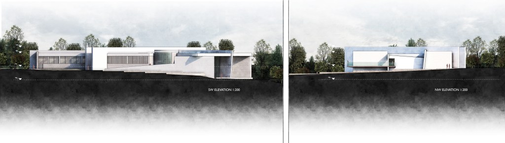 The program is split with a monumental gesture of two concrete walls penetrating the building volume and anchoring it one the site. Simultaneously, a multi-level ramp that meanders around the different functions becomes the central circulation artery, binding the scheme into a coherent and functional ensemble. The identity of this proposal lies at the juxtaposition of the connector and the separator -the Ramp and the Walls-.