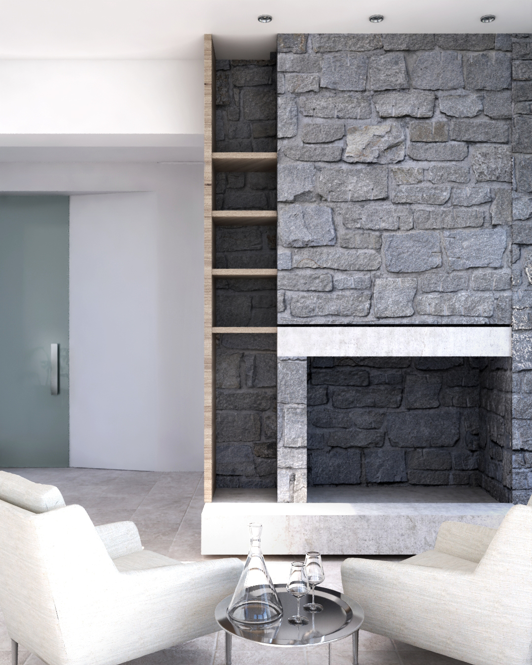 This project is a four-bedroom family residence at a medium density suburb of Patras. The first design challenge here was to provide large and naturally lit living spaces by simultaneously ensuring privacy from the adjoining lots. The second was, to avoid the creation of a very big volume that would impose itself on the street. In order to achieve this, an entry axis is created that splits the house in two volumes, according to function. One for the living quarters and one for the bedroom quarters, along with an independent guest house. This gesture solves the morphological problem of the single volume a one-storey part and two-storey part, allowing for a separate approach of the two facades regarding form. Thus, the bedroom quarters are more solid to ensure privacy and quietness, while the living quarters are more transparent, with large areas of glazing to allow for views towards the sea and the pool, with heavily articulated stone columns holding the concrete slab and creating protected semi-outdoor spaces.