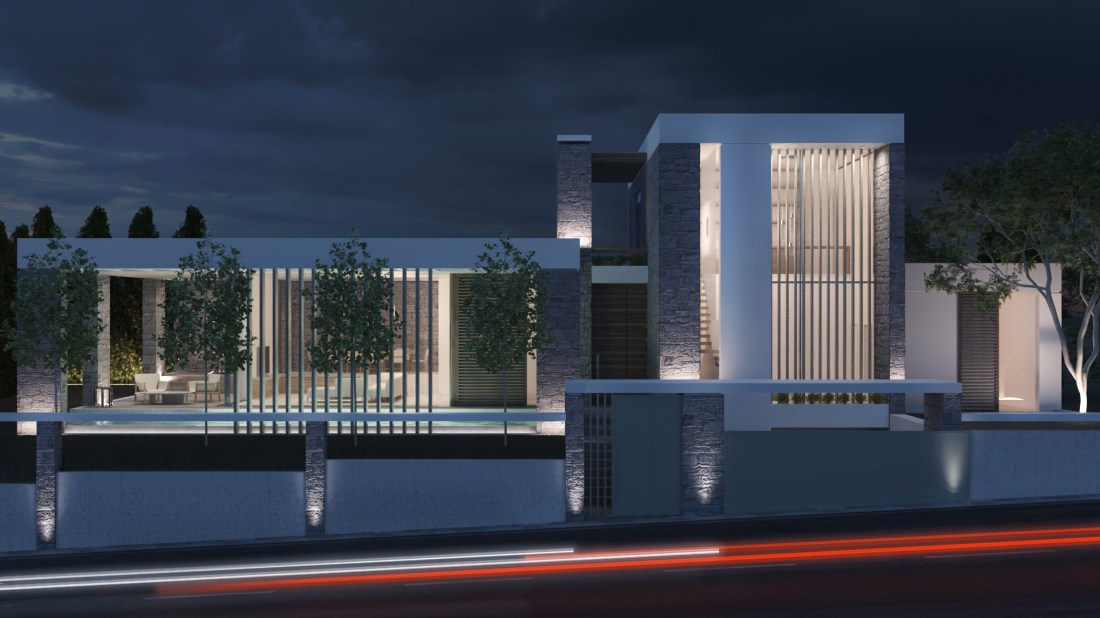 This project is a four-bedroom family residence at a medium density suburb of Patras. The first design challenge here was to provide large and naturally lit living spaces by simultaneously ensuring privacy from the adjoining lots. The second was, to avoid the creation of a very big volume that would impose itself on the street. In order to achieve this, an entry axis is created that splits the house in two volumes, according to function. One for the living quarters and one for the bedroom quarters, along with an independent guest house. This gesture solves the morphological problem of the single volume a one-storey part and two-storey part, allowing for a separate approach of the two facades regarding form. Thus, the bedroom quarters are more solid to ensure privacy and quietness, while the living quarters are more transparent, with large areas of glazing to allow for views towards the sea and the pool, with heavily articulated stone columns holding the concrete slab and creating protected semi-outdoor spaces.
