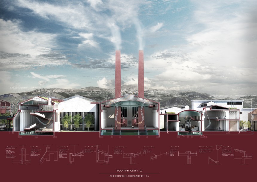 This competition proposal for the abandoned Ladopoulos Factory at Patras, aims in the creation of a place that will reintroduce the local community with its industrial past but will also act as a catalyst for the transformation of its economic model. After carefully examining the space, four plus one characteristic points of reference are chosen, with the intention of creating a proposal true to the vocabulary of industrial modernism but simultaneously applying the principles of critical regionalism in order to preserve the memory of the place. These points are the multi-layered circulation, the minimal articulation of forms, the “industrial street” and the chimneys. In the centre of all this lies the water element as the symbolic and functional protagonist of the scheme.