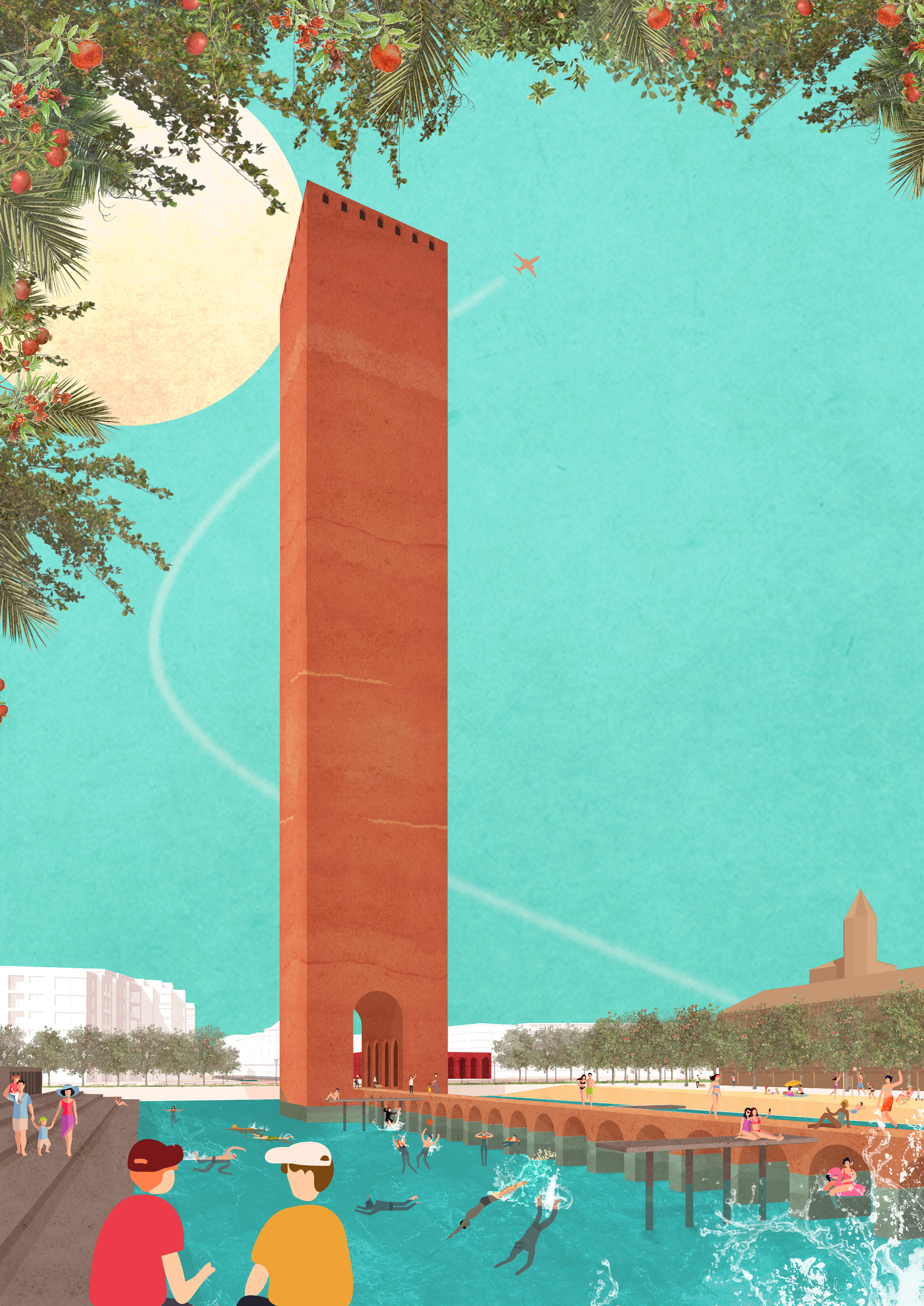 The confluence of the two rivers is marked by the presence of a 100m tall water tower, which celebrates the city’s history, re-establishes a lost visual connection from the city centre to the Alhambra, and acts as a monument for the importance of water as a finite resource.