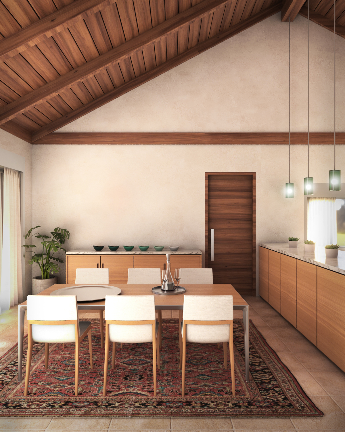 Due to the place’s significant resemblance to the north Italian countryside, the architectural expression of the building takes cues from the country houses of Tuscany, by adopting a warm material palette, with minimal expression of the openings and a double-pitched roof with worn roman tiles. The roof in addition to the square shaped loggia which is placed on the South – West side of the house, greatly enhance the energy performance of the dwelling as they shelter the external skin from direct sunlight, while the careful placement of glazing minimizes solar gains.