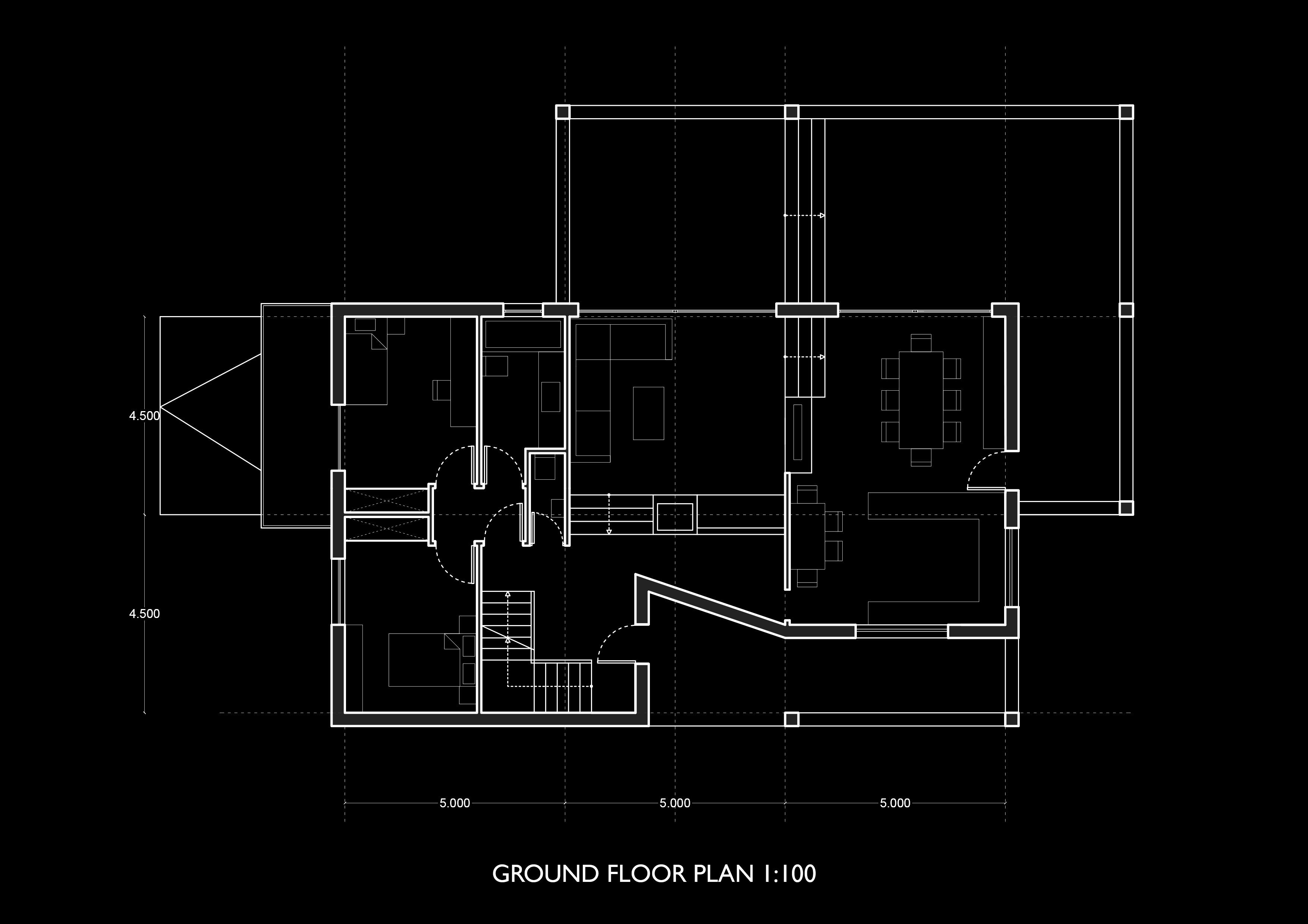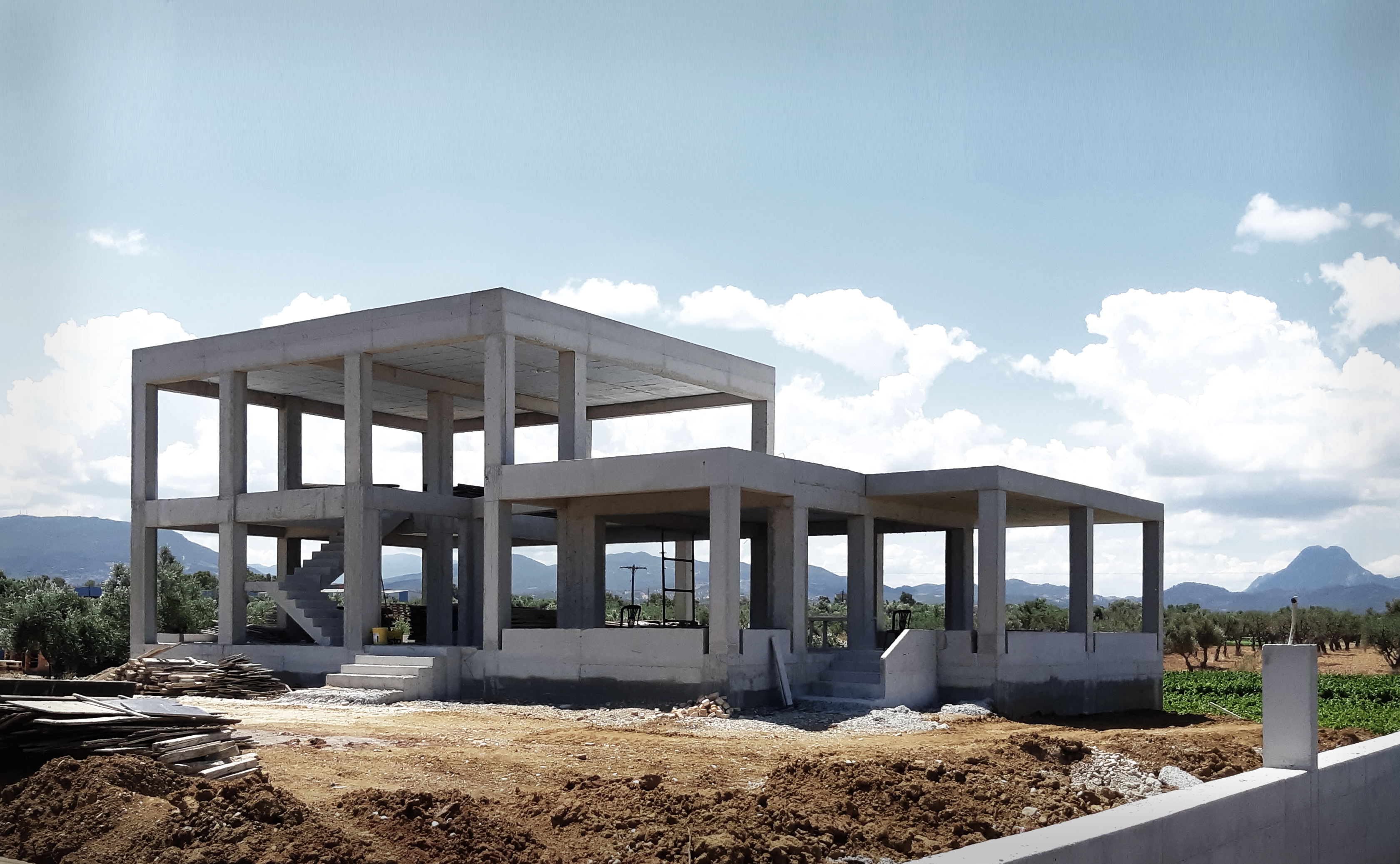 This four-bedroom family house is located at the south of Patras, amidst a vast vineyard on a relatively flat site. The site enjoys views of the natural environment surrounding Mount Erymanthos on its south side. Therefore, the design revolves around a double height living room which is in direct contact with a south-facing outdoor loggia overlooking the vineyards and the mountain, becoming the functional core of the dwelling.